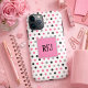 Pretty and girly, this affordable phone case features pink, black and grey polka dots on a white background. In the centre is a monogrammed box with a template for inserting your initials. Personalise yours today!