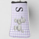 Cute lady's golf club cover done in a lavender and white gingham pattern. Fun graphics of a fuzzy white poodle decorates the cover. Personalise the black one letter monogram, to read what you want. Great gift idea. Matching driver cover is available.