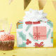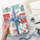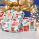 This wrapping paper features Christmas presents all wrapped up in red, pink and blue-green wrap.