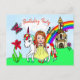A pretty folk art style cartoon red hand drawn princess and unicorn with castle, flowers and butterfly in the background. A great pretty but affordable way to give out lots of fun fairy tale birthday invitations.