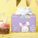 Customise this cute Easter Bunny gift wrap with your own personalised text with your child's name in white script. This adorable bunny rabbit sits in a pretty Easter basket on a lovely purple wrapping paper for your presents.