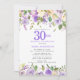 Honor a special woman with this elegant and feminine 30th Birthday party invitation. 30th is written in large purple text. Birthday celebration follows. The honored guest's name is also in purple capital letters. The birthday celebration details are surrounded top and bottom purple floral borders. The floral elements are nestled in deep green leaves. While it is a traditional design, the open and airy botanical foliage and text give it a contemporary vibe.