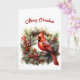 This is an illustration of a vibrant red cardinal perched on a branch. The cardinal is surrounded by a festive wreath made of holly leaves, red berries, pine needles, and other greenery. The artwork captures the bird in beautiful detail, highlighting its striking red feathers and the natural elements around it.