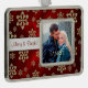 Elegant gold snowflakes are scattered against a dark burgundy red background. This is a beautiful setting for your own photograph. A silver banner holds your custom text to personalise the ornament. Festive and elegant!