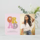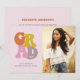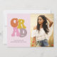 This fun graduation invitation has a modern take on vintage 1970s design. The front of the card includes 70s lettering on the left and a vertical photo on the right. The retro typography reads "Grad" in shades of rust orange, harvest gold, faded purple, and pretty pink against a light pink background. The graduate's name and school are written below the typography, and the graduation year is written across the D in "Grad". On the back, there is a template for graduation party details.