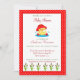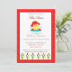 A pretty girl baby shower shower Spring and Summer themed invitation, this design is set upon a red polka dot background. The invitation features a cute duck sitting in water with a cute hat and grass at the bottom. Customise yours today!
