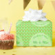 There is a pale green circle with white marbled patterns on it which contains customisable text so you can include all the important details.