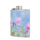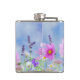 Pretty pink flowers and lavender meadow on a bright spring day against a blue sky.
