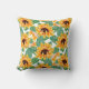 A pillow with a cute summery pattern. Pretty yellow sunflowers surrounded by green leaves in a repeating pattern.