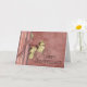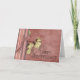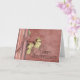 Dark-Rose coloured background looking like aged material, decorated with pretty swirls. A striped border on the left in complementing colours, with a pretty bow, and some white flowers. A unique card for a happy anniversary - customisable with your own text.