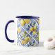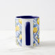 Bright, pretty Mediterranean tile print coffee mug- bright cobalt blue, yellow, light blue with lemons in the style of tile and linen art from Positano Italy. Practical gift for someone who loves Italian style pottery. (There is a matching kitchen towel and apron.)