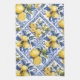 Bright, pretty Mediterranean tile print kitchen towel - bright cobalt blue, yellow, light blue with lemons in the style of tile and linen art from Positano Italy. Practical gift for someone who loves to cook. (There is a matching apron and coffee mug.)