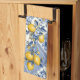 Bright, pretty Mediterranean tile print kitchen towel - bright cobalt blue, yellow, light blue with lemons in the style of tile and linen art from Positano Italy. Practical gift for someone who loves Italian style pottery.