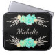 Laptop sleeve featuring a custom monogram and teal and silver flowers