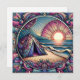 Pretty blank notecard with an ai illustration of a tent on a beach as the sun is rising. Pretty blue, pink and purple elements.