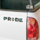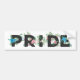 Beautiful bumper sticker with PRIDE written in large letters decorated with flowers in the colors of the trans flag along with berries and greenery in pink, blue, and white.