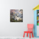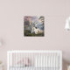 A sweet magical fairytale themed poster wall art. A pretty unicorn with a gold horn and eyes sitting under a rainbow near a castle.