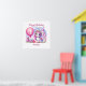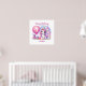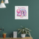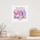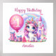 A pretty unicorn is celebrating her first birthday with gifts, a pink balloon, and a pink castle. Perfect for a baby girl's first birthday party. Add your own customised text.