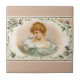 A Portrait of a Pretty Victorian lady wearing a soft blue dress surrounded by dainty flowers. Image of a Victorian Trade Card on a beige background.