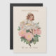 Sweet smiling vintage girl in a white frock sitting among blooming pink roses with Valentine greetings.