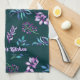 Cute, personalized kitchen towel in a pretty color pattern of pink, purple and aqua blue watercolor floral design on a pretty deep aqua green background.