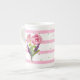 Pretty pink and white striped bone china mug, with small green polka dots and beautiful watercolor flower bouquets. Personalise the green text for yourself or as a lovely gift idea for her.