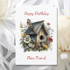 Birthday card for a friend. Cute watercolor rustic birdhouse with a cute bird atop surrounded by pretty flowers.