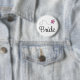 Pretty wedding day bridal party button has fun pink butterfly logo and Bride slogan.