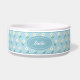 Pretty illustrated floral pattern of white flowers with green stems and some leaves on a light blue background colour. There is also an oval shape in blue that has a personalizable text area for the name of the pet in lovely white colour script font.