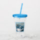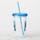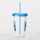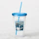 This acrylic drink tumbler with straw and lid has a pretty white mother swan swimming in a blue lake surrounded by trees with her baby in an ornate light blue border on the front and back.