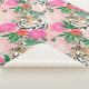 This boho hand-painted exotic tiger animal and floral artsy design looks perfect for a tropical jungle feel decor. A stylish blooming flowers watercolor painting, featuring a collection of white, blush pink, hot pink, red flowers and green leaves, and a golden, white, and black brush strokes tiger drawing, on a pale pink background.