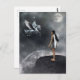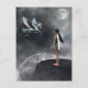 A pretty, white-winged fairy waits on top of a mountain and watches a beautiful white flying horse come towards her. This is against a background of a starry sky with a moon and a magical planet.