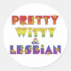 Are you pretty and witty and Lesbian? Show your pride with this whimsical sticker! The text reads: “Pretty witty & lesbian”. The lettering has a blend of colours from the Rainbow Flag. You can change the background colour, if you’d like. Want this or a similar design on another item? Browse my Errant Gallery.
