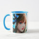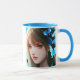 Ai art depicting beautiful woman with blue butterflies in her hair. Personalised coffee mug.