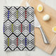 Bold pattern of black and white with little accents of yellow, blue, and red.