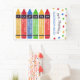 Classroom rules banner with six rules for a classroom personalised with the teacher's name beneath colourful stars. The rules are written on crayons in red, yellow, green, and blue. The text is customisable so you can change to your rules! Kindergarten classroom rules banner with colourful crayons and stars against a white background.