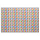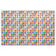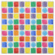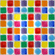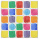 A colourful fabric decorated with a geometric pattern of squares and circles in a rainbow of primary colours including red, green, orange, yellow, blue, purple and pink painted in watercolor.