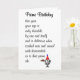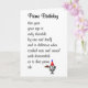 A funny happy birthday card, featuring a bad poem and illustration, for someone born on a date that is only divisible by one and itself (and likes math). Our character, tillie, is wearing a birthday hat and holding a plate of prime rib.