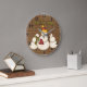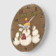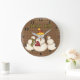 Add this SNOW FUN primitive snowman clock to any room in your country home. Three whimsical snowmen are all decked out in their winter best and are all ready to play in the snow. Falling snow around the perimeter of the clock. Background is country plaid. The snowman in the centre is holding a heart.