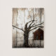 Primitive Country Woodgrain Winter Tree Red Barn Jigsaw Puzzle