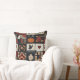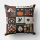 This throw pillow features a folk art patchwork aesthetic, arranged in a grid of square blocks that blend both appliqué and pieced elements. Appliquéd motifs include a bold orange pumpkin, a black crow, red hearts, chickens, and stylised florals, while the pieced blocks showcase traditional geometric quilt patterns such as stars, diamonds, and crosses. The use of deep reds, creams, and dark blues/blacks, accented with patterned fabrics like polka dots, florals, and textured solids, creates a warm and rustic style. Perfect for farmhouse décor, country living, primitive crafts, and seasonal quilts, this design embodies the charm of traditional quilting with a cosy, handmade feel.