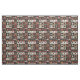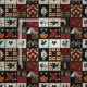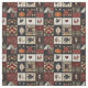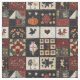 This fabric features a folk art patchwork aesthetic, arranged in a grid of square blocks that blend both appliqué and pieced elements. Appliquéd motifs include a bold orange pumpkin, a black crow, red hearts, chickens, and stylised florals, while the pieced blocks showcase traditional geometric quilt patterns such as stars, diamonds, and crosses. The use of deep reds, creams, and dark blues/blacks, accented with patterned fabrics like polka dots, florals, and textured solids, creates a warm and rustic style. Perfect for farmhouse décor, country living, primitive crafts, and seasonal quilts, this design embodies the charm of traditional quilting with a cosy, handmade feel.
