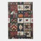 This kitchen towel features a folk art patchwork aesthetic, arranged in a grid of square blocks that blend both appliqué and pieced elements. Appliquéd motifs include a bold orange pumpkin, a black crow, red hearts, chickens, and stylised florals, while the pieced blocks showcase traditional geometric quilt patterns such as stars, diamonds, and crosses. The use of deep reds, creams, and dark blues/blacks, accented with patterned fabrics like polka dots, florals, and textured solids, creates a warm and rustic style. Perfect for farmhouse décor, country living, primitive crafts, and seasonal quilts, this design embodies the charm of traditional quilting with a cosy, handmade feel.