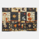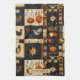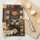 This kitchen towel features a folk art quilt-inspired patchwork pattern with a warm autumn palette of orange, brown, gold, black, and cream. The blocks showcase rustic motifs including pumpkins, birds, stars, hearts, and swirling vines, all arranged in a traditional quilt block structure. With its distressed, aged fabric look, this pattern captures the charm of primitive Americana and seasonal harvest themes. Perfect for fall décor, rustic farmhouse style, country crafts, and folk-inspired designs that celebrate the cosy spirit of autumn.
