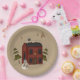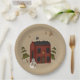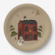 Primitive style paper plates show a traditional red colonial house with snow on the roof top. A whimsical snowman stands out front. Snow covered trees peak out from behind the house and stars twinkle in the sky.