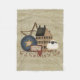 Country primitive style blanket has a burlap print background, a tan saltbox colonial house, grapevine star, blue star plate, a big furry sheep, heart and pip berry vines and a SIMPLIFY sign. The burlap fabric has a slightly wavy and wrinkled look to it for a more realistic look. A matching pillow is also available.
