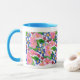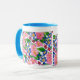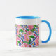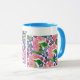 A good quality white ringer mug with a powder blue rim and handle. The handpainted floral design is of pink and blue primroses and the text around the top reads, 'A special mug for a special mother. Dishwasher and microwave safe. See also matching greeting cards, gifts and apparel.