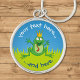 Prince frog cartoon with crown over green grass under blue sky. Two custom text fields on circle.