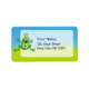 Prince frog cartoon with crown over green grass under blue sky. Custom text fields for name and address.