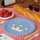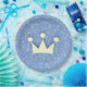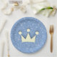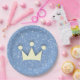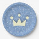 Artificial blue glitter plate with an image of a crown. Pink is also available.